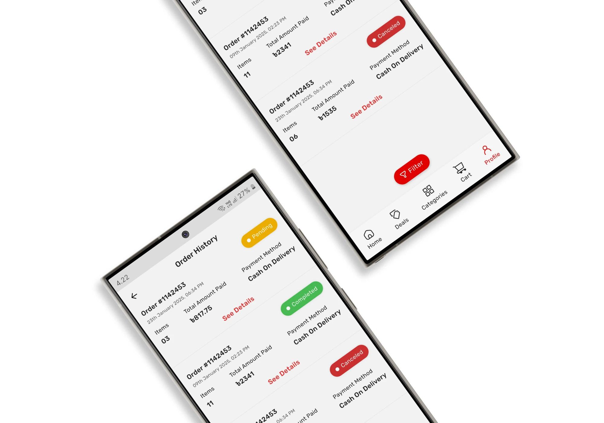 I repositioned the order cancellation button below the items list, ensuring that users could easily see the items first and then make decisions like cancelling the order. I also removed the background from the cancellation button to make it less prominent, reducing the visual clutter and guiding users toward more critical actions.