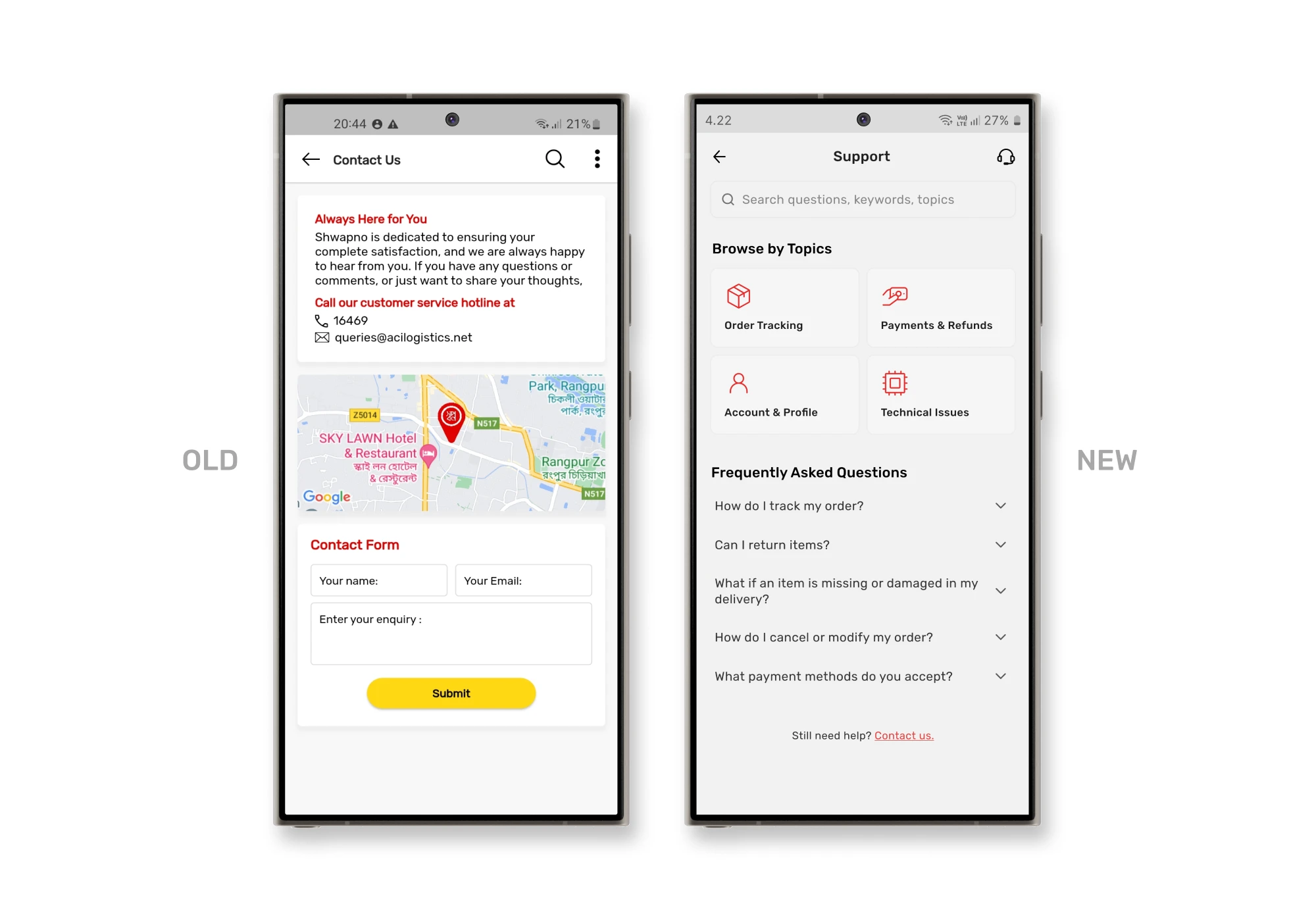 Swapno’s Contact Us page describes how they are there for users, but the priority should be problem-solving and enabling quick contact. They provided a phone number and an email address as clickable buttons, but the font size was very small, making it hard to notice and click. Additionally, there was a map showing the user’s location, which served no clear purpose, adding unnecessary clutter.